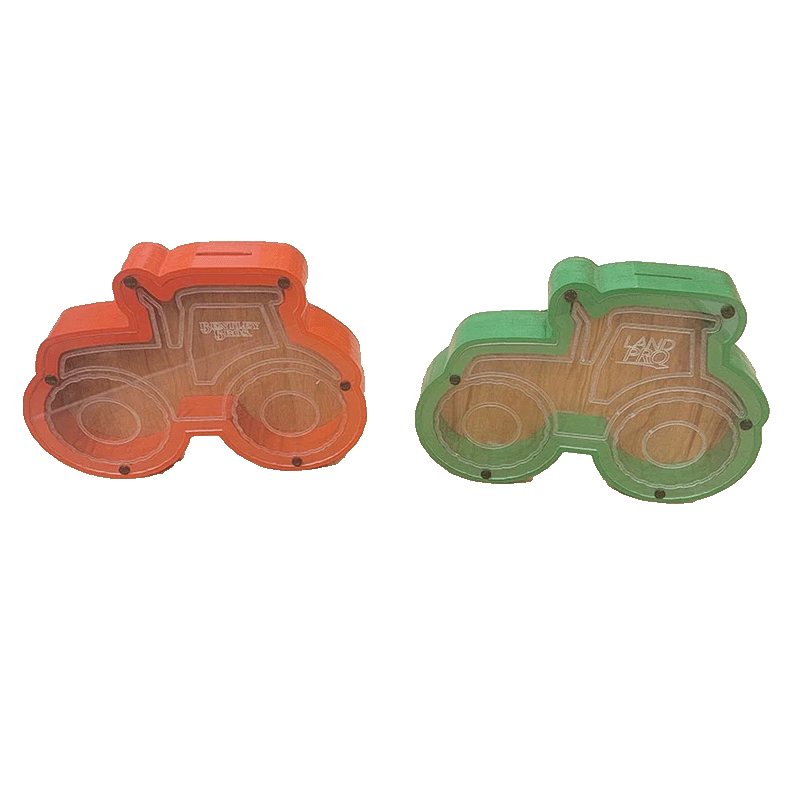 These piggy banks are a big hit with the kids! Created out of MDF, acrylic, and veneered cherry, not only do they look great but they are durable as well.